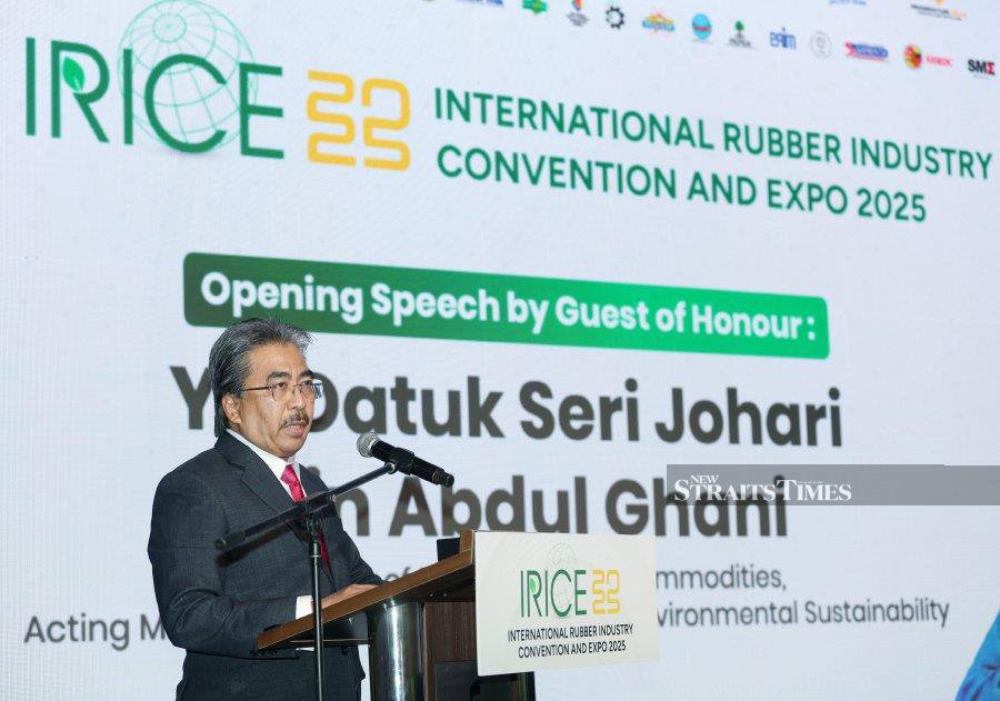 รัฐมนตรีว่าการกระทรวงการเพาะปลูกและสินค้าโภคภัณฑ์ ดาทุก ซรี โจฮารี อับดุล กานี กล่าวสุนทรพจน์ในพิธีเปิดอย่างเป็นทางการของการประชุมอุตสาหกรรมยางนานาชาติและงานเอ็กซ์โป 2025 ณ ศูนย์การประชุมกัวลาลัมเปอร์ NSTP/EIZAIRI SHAMSUDIN