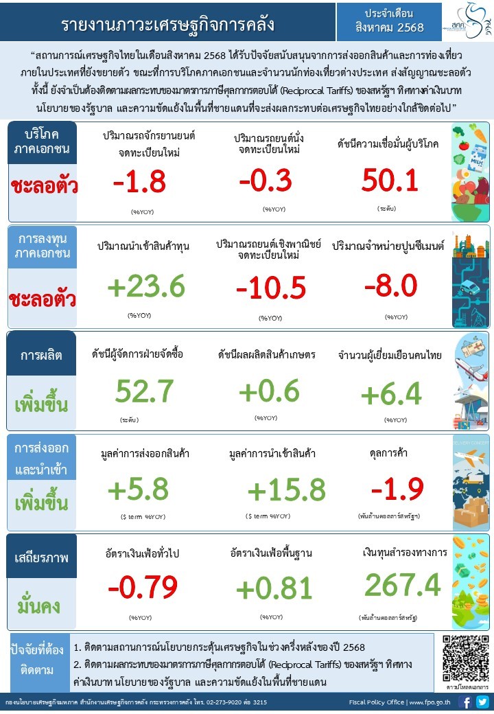 สำนักงานเศรษฐกิจการคลัง (สศค.) เปิดเผยสถานการณ์เศรษฐกิจไทยในเดือนสิงหาคม 2568 ได้รับปัจจัยสนับสนุนจากการส่งออกสินค้าและการท่องเที่ยวภายในประเทศที่ยังขยายตัว ขณะที่การบริโภคภาคเอกชนและจำนวนนักท่องเที่ยวต่างประเทศ ส่งสัญญาณชะลอตัว ทั้งนี้ ยังจำเป็นต้องติดตามผลกระทบของมาตรการภาษีศุลกากรตอบโต้ (Reciprocal Tariffs) ของสหรัฐฯ ทิศทางค่าเงินบาท นโยบายของรัฐบาล และความขัดแย้งในพื้นที่ชายแดนที่จะส่งผลกระทบต่อเศรษฐกิจไทยอย่างใกล้ชิดต่อไป