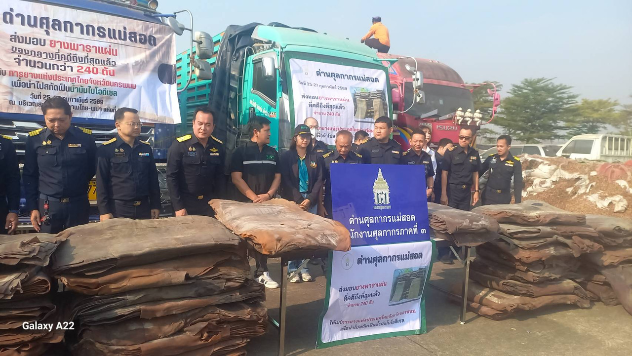 เมื่อวันที่ 25 กุมภาพันธ์ 2569 นายยอดพล วิชญกุล นายด่านศุลกากรแม่สอด ชายแดนไทย-เมียนมา อ.แม่สอด จ.ตาก ร่วมกับสถานีตำรวจภูธรแม่สอด หน่วยเฉพาะกิจราชมนู และ ส่วนราชการที่เกี่ยวข้อง ได้ทำการส่งมอบยางพาราแผ่น ลักลอบนำเข้าจากประเทศเมียนมา ที่คดีถึงที่สุดแล้ว จำนวน 8 คดี น้ำหนัก รวมประมาณ 240,000 กิโลกรัม (240 ตัน) ให้แก่การยางแห่งประเทศไทยจังหวัดนครพนม เพื่อนำไปเข้าสู่กระบวนการ ในการสกัดเป็นน้ำมันไบโอดีเซล ส่งต่อให้เกษตรกรใช้เป็นพลังงานทางเลือก เพื่อลดต้นทุนการผลิตของเกษตรกรและ ดูแลสิ่งแวดล้อม โดยนายอัศวิน คำสุวรรณ ผู้อำนวยการศูนย์เรียนรู้ยางพารานครพนม เป็นผู้รับมอบ ณ สะพานมิตรภาพ ไทย-เมียนม่า แห่งที่ 2 อ.แม่สอด จ.ตาก การดำเนินการส่งมอบยางพาราแผ่นในครั้งนี้ เป็นไปตามกฎหมายศุลกากรเพื่อป้องกันของกลางกลับเข้าสู่ระบบ การค้าโดยมิชอบ และยังเป็นการเปลี่ยนของกลางให้กลายเป็นพลังงานเพื่อเกษตรกร ไม่ให้ถูกทำลายไปอย่างสูญเปล่า สนับสนุนเศรษฐกิจหมุนเวียนอย่างเป็นรูปธรรม สะท้อนความมุ่งมั่นของกรมศุลกากร ในการเป็นองค์กรชั้นนำที่สร้างความปลอดภัยและยั่งยืนให้กับเศรษฐกิจไทย ตามนโยบายของรัฐบาล ภายใต้การอำนวยการของนายเอกนิติ. นิติทัณฑ์ประภาศ รองนายกรัฐมนตรี และรัฐมนตรีว่าการกระทรวงการคลัง และนายพันธ์ทอง ลอยกุลนันท์ อธิบดีกรมศุลกากร